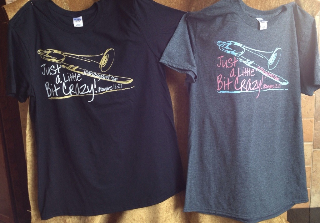 Another new merch item is ready to travel on the Where I Am Tour with me! These awesome T-Shirts are just a “little bit crazy” with the infamous trombone from the solo in the middle of the song, Little Bit Crazy (hear the new song at http://JenHaugland.com/music ). Scripture verse reference: Romans 12:2 “Do not be conformed to this world, but be transformed by the renewal of your mind, that by testing you may discern what is the will of God, what is good and acceptable and perfect.”